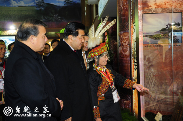 賈慶林主席仔細(xì)觀展并不時地與身邊的臺灣少數(shù)民族頭目交談,了解情況。徐波/攝影