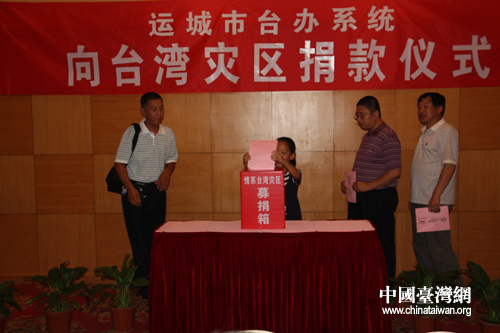運城市臺辦主任董澤民在捐款活動上表示,自從8月8日臺風“莫拉克”侵襲臺灣中南部地區以來,運城市各界群眾紛紛通過電話、書信等方式向臺辦部門了解受災地區情況,咨詢捐款事宜。今天借此機會我們帶來了全市人民的愛心、誠心,希望通過大家的共同努力幫助災區同胞渡過難關。