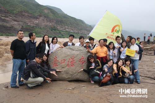 臺(tái)灣青年團(tuán)一行在壺口瀑布大石前合影留念(中國臺(tái)灣網(wǎng) 陳寧 攝)