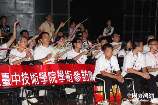 臺中技術學院的同學們面帶微笑,搖動著熒光棒,不時賣力地鼓掌。(中國臺灣網 鐘寶華 攝 )