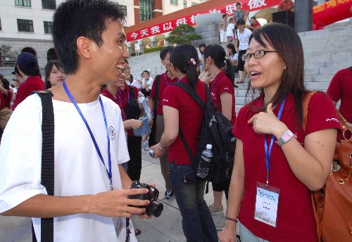 7月4日,一名臺灣大學的學生(右)和一名廈門大學的學生在開幕式后交談。當日,來自臺灣9所大學和廈門大學、集美大學的共158名師生聚集在廈門大學,舉行海峽兩岸大學生“閩南文化研習”夏令營開幕儀式。參加夏令營的師生將走訪廈門、泉州、漳州等地,體驗閩南文化。新華社發(fā)(黃少毅 攝)