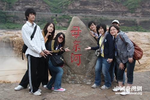 臺灣青年團一行在壺口瀑布大石前合影留念(中國臺灣網 陳寧 攝)