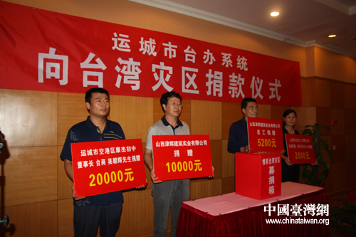 運城市臺辦主任董澤民在捐款活動上表示,自從8月8日臺風“莫拉克”侵襲臺灣中南部地區以來,運城市各界群眾紛紛通過電話、書信等方式向臺辦部門了解受災地區情況,咨詢捐款事宜。今天借此機會我們帶來了全市人民的愛心、誠心,希望通過大家的共同努力幫助災區同胞渡過難關。
