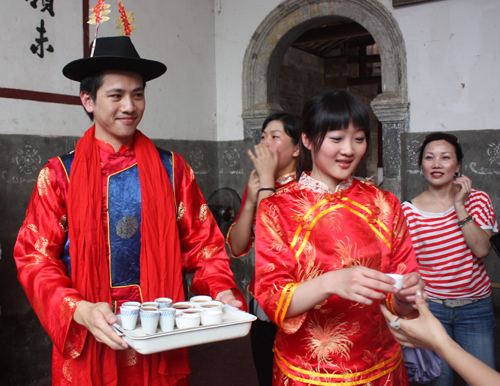 上轎、過米篩、拜堂、喝交杯酒……這些客家婚俗的禮儀在臺灣學(xué)子們的眼中十分新鮮,十分好玩。扮演新郎的臺灣大葉大學(xué)的學(xué)生簡菟吾直言當(dāng)新郎的感覺很好,掀開新娘蓋頭的那一刻真的感覺自己結(jié)婚了。在這些年輕人的眼中,客家土樓有其獨(dú)特的魅力與吸引力。而參加客家婚禮對于他們來說更是新鮮。逢甲大學(xué)研究所中文系學(xué)生賴保妃表示,她是客家人,雖然之前對客家的習(xí)俗有一定了解,但是還是第一次親自參加客家的婚禮。她說,客家婚禮的習(xí)俗與臺灣的傳統(tǒng)婚禮接近,雖然繁瑣,但這些所體現(xiàn)的都是千年來中華文化的沉淀,很有意義,覺得很有歷史價值。