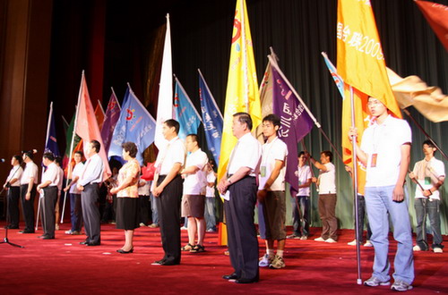 隨著海協(xié)會會長陳云林宣布“全國臺聯(lián)2009年臺胞青年千人夏令營”北京總營正式開營,臺胞青年們用尖叫和掌聲徹底將會場點燃。全國人大常委、全國臺聯(lián)會長梁國揚致歡迎詞;中央統(tǒng)戰(zhàn)部副部長尤蘭田,臺盟中央副主席黃志賢,共青團中央常務書記、全國青年主席王曉,海協(xié)會副會長王富卿,教育部港澳臺辦公室副主任李大光等有關領導,授總營旗和各團團旗。開營式結束后,中央民族歌舞團用熱情奔放、極具民族特色的歌舞節(jié)目,再次表達了北京主人熱誠歡迎貴客的喜悅心情。