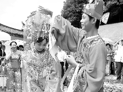 在最高的方樓——和貴樓,樓主簡良發(fā)唱起動(dòng)聽的土樓山歌,引得不少臺(tái)灣青年朋友現(xiàn)場學(xué)唱。在最古老的土樓——裕昌樓里,幾個(gè)臺(tái)灣青年饒有興致地跟著土樓人學(xué)做起了糍粑。在“高山水鄉(xiāng)”塔下村,土樓人家娶親、土樓姑娘拋繡球等民俗表演更是令臺(tái)灣青年陶醉不已。來自臺(tái)灣嘉義高級商業(yè)職業(yè)學(xué)校的學(xué)生李經(jīng)綸幸運(yùn)地被“新娘子”拋中了繡球,當(dāng)起了“土樓女婿”,快樂地和“土樓新娘”拜了“天地”,喝了“交杯酒”,進(jìn)了“洞房”。