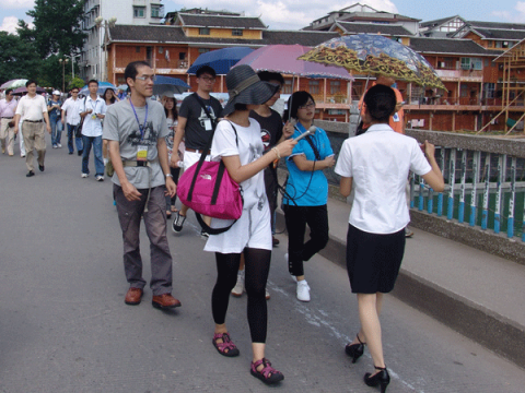 華夏經緯網7月14日訊:第九屆“湖湘文化之旅”參訪團今天來到懷化市芷江侗族自治縣參觀考察,兩岸大學生參觀了龍津風雨橋、天后宮、飛虎隊紀念館以及中國人民抗日戰爭勝利受降舊址等。