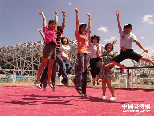 時值正午,烈日當空。但臺灣營員們的激情一點也不比驕陽遜色。對著鏡頭,他們一次次熱情的躍起并歡呼:“北京奧運,我們來了!”興奮與激動溢于言表。