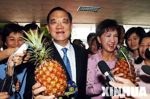 2006年4月20日,中國國民黨榮譽主席連戰(zhàn)參觀廈門臺灣水果銷售集散中心。連戰(zhàn)夫婦稱贊臺灣水果好吃,為臺灣水果做起“廣告”。新華社記者 王建華 攝