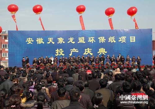 慶典儀式由淮北市市長牛弩韜主持,中共淮北市委書記、市人大常委會主任畢美家和杜集區委書記顧文致賀詞,安徽省副省長黃海嵩宣布安徽天象龍盟環保紙項目正式投產。安徽天象龍盟環保紙項目淮北和臺灣合作雙方負責人孔令發、梁石輝分別介紹項目的合作、生產和產品情況。