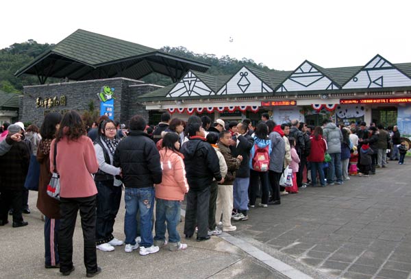 1月26日8時30分,贈臺大熊貓“團團”“圓圓”在臺北市動物園與臺灣民眾正式見面。眾多臺灣民眾在動物園門口排隊等候與“團團”“圓圓”見面。動物園規定,每日限定參觀名額2.2萬人次。(新華社記者王妍攝)