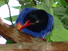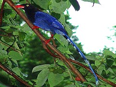 “臺灣藍鵲”為臺灣地區特有,與烏鴉同屬鴉科,叫聲同樣沙啞,羽色卻與烏鴉迥然不同,亮麗無比。頭、臉、頸、喉、胸都是黑色,黃色的眼珠包圍黑色的瞳孔,鮮紅色的鳥喙、雙腳,身體上半部可目視處及下半部的腹部呈鮮藍色,尾下覆羽則為白色,有十二根尾羽,最長二羽為藍根白尾,其于為黑根白尾,左右對稱。尾羽長占了總體長的三分之二,飛行時總以直線前進,非常優雅高貴。