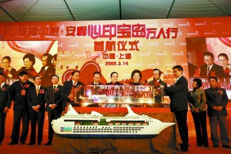 3月14日傍晚6時許,北外灘上海港國際客運中心碼頭,伴隨著如潮的歡呼聲和絢麗的煙花,“安利心印寶島萬人行”首航郵輪緩緩駛出港口。這是自兩岸基本實現三通以來的第一個郵輪直航團,也是第一個赴臺萬人團。此舉對于刺激臺灣經濟景氣無疑是個大好消息,島內輿論反響熱烈。
