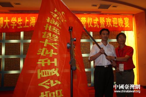 國臺辦交流局副局長嚴中洲為夏令營團長陳宗韓授旗。(中國臺灣網 肖燕 攝)