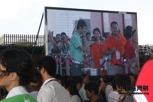 排隊等候進館期間,一位同學接受中國館表演區(qū)主持人的現(xiàn)場采訪。(中國臺灣網(wǎng) 肖燕 攝)