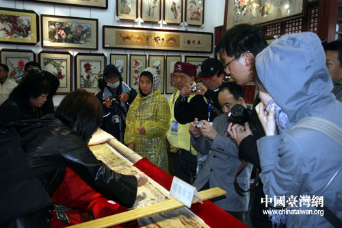 兩岸媒體在清明上河園內(nèi)欣賞刺繡。(攝影 鐘寶華)