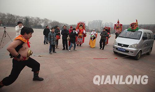 其中,天橋著名的“爬桿兒于”的后代于健表演的單耳拉汽車(chē),在一只耳朵上栓上繩子,能拉動(dòng)一輛面包車(chē),堪稱京城獨(dú)一份兒。而卞輝表演的羅圈獻(xiàn)彩,空手拿著兩個(gè)騰編的籠屜,卻能為您“獻(xiàn)”出一桌的酒席。此外,京城快板名家李春華的徒弟、快板小神童安子元還將表演花唱繞口令,這個(gè)“我要上春晚”節(jié)目的“人氣王”雖然才15歲,卻將快板打得出神入化。