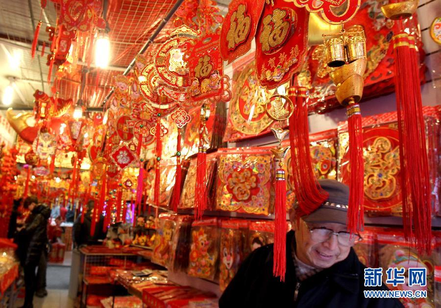 1月18日,市民在上海豫園小商品市場內選購新春飾品。春節臨近,富有傳統文化特色的上海豫園張燈結彩,洋溢著濃濃的年味兒。 新華社記者 劉穎 攝