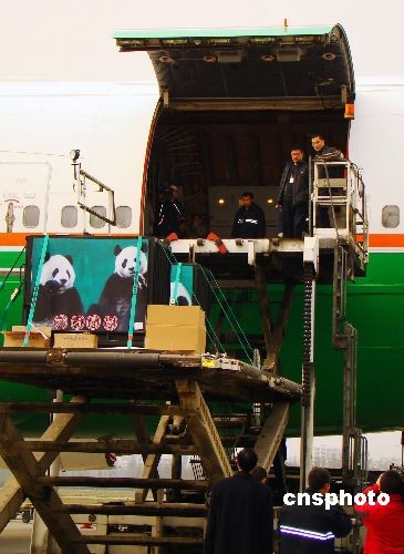 12月23日13時40分,在“家鄉人”舉行隆重的歡送儀式后,贈臺大熊貓“團團”“圓圓”登上“熊貓專機”,臺灣長榮航空公司波音七四七-四00客貨機隨后載著它們和贈臺17棵珙桐樹苗飛往寶島臺灣。 中新社發 霍潺 攝