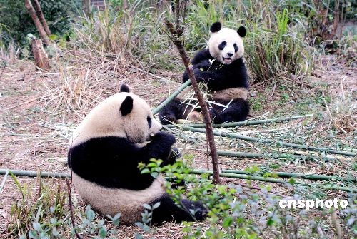 資料圖片:12月22日,在四川省雅安市“中國保護大熊貓研究中心雅安碧峰峽基地”,“團團”、“圓圓”歡快度過在家鄉最后一日。 中新社發 張國軍 攝