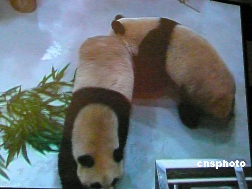 大陸贈臺大熊貓“團團”“圓圓”二十三日晚間抵達臺北的新家——臺北市立動物園新光特展館。圖為“團團”和往常一樣,喜歡跟在“圓圓”身后,如影隨形。 中新社發 路梅 攝