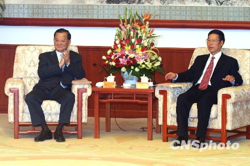 7月29日,中共中央政治局委員、中共天津市委書記張高麗在天津迎賓館會見來津出席第二屆天津——臺灣投資合作洽談會的中國國民黨榮譽主席連戰(zhàn)。 中新社發(fā) 郭曉帆 攝