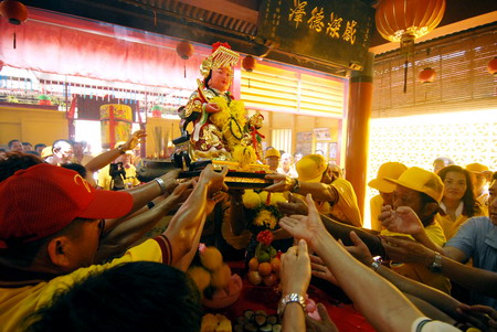 4月27日,在馬來(lái)西亞雪蘭莪州巴生港地區(qū)吉膽島(又稱蟹島)一個(gè)華人漁村,村民爭(zhēng)相觸摸媽祖神龕祈求平安。