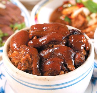 以小盅盛裝的“蹄花黃豆”得花上兩天工夫,燒出紅潤飽滿的色澤,黃豆調和了豬腳的油膩感。一甕約兩人分,不過有趣的是,甕過完年則要還給老板。