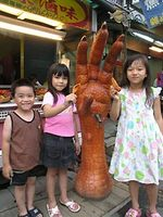 高雄市“正義夜市”路旁的福州熏茶鹵味攤前,有一支重達20公斤、高140公分的超大支模型雞腳,雖然只能看不能吃,卻為攤商帶來不少生意。