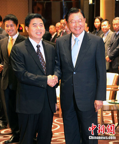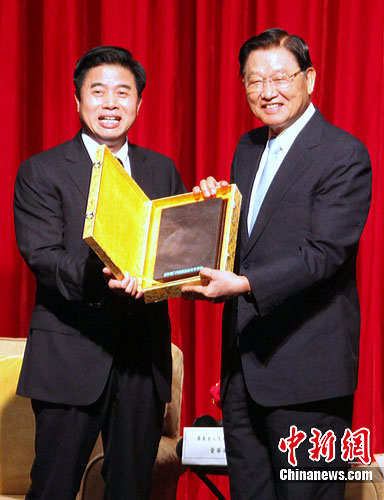8月17日,廣東省省長黃華華在臺北與海基會董事長江丙坤會面,雙方關(guān)注在兩岸經(jīng)貿(mào)合作框架協(xié)議(ECFA)簽署后進(jìn)一步促進(jìn)粵臺經(jīng)貿(mào)合作。中新社發(fā) 劉舒凌 攝
