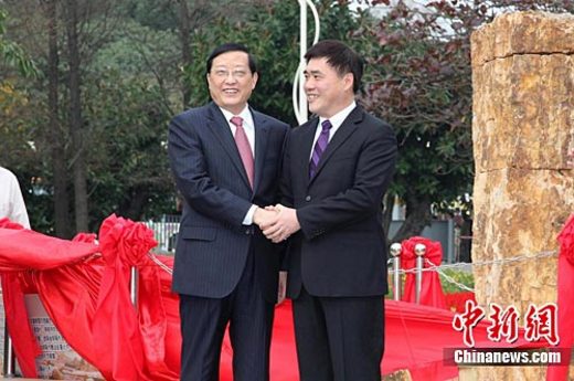 2月17日,正在臺灣參訪的遼寧省省長陳政高(左)與臺北市長郝龍斌(右)在臺北花博會共同為三顆木化石揭幕,該木化石的年齡已近1.5億年,是遼寧省贈與臺北市的一件珍貴禮品,寓意兩地關系“天長地久”。中新社記者 符永康 攝 中新社臺北2月17日電 (符永康 董會峰)17日下午,遼寧省贈臺硅化木揭幕儀式在臺北花博會圓山公園區舉行,遼寧省省長陳政高與臺北市長郝龍斌共同為三顆年齡約1.5億年的木化石揭幕,以這件特別的禮品寓意兩地關系“天長地久”。