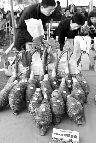 2月19日,“遼寧采購臺灣農特產品簽約啟運儀式”在臺中果菜市場舉行,現場簽訂采購協議總金額約4000萬元新臺幣。首批裝滿臺中茂谷柑、蜂蜜等當地優良農特產品的5輛貨柜車隨即啟運,將由臺中港直接運往遼寧。圖為儀式現場展示的臺中特產大甲芋頭。新華社記者 宋立東攝