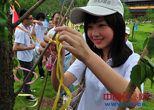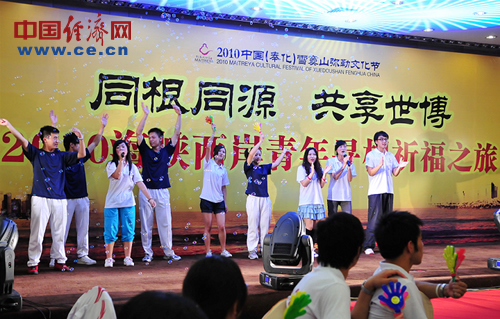 這是“同根同源共享世博” 2010(奉化)海峽兩岸青年尋根祈福之旅活動的內容之一。作為“2010中國(奉化)雪竇山彌勒文化節”的重要組成部分,2010(奉化)海峽兩岸青年尋根祈福之旅豐富多彩。7月16日晚上,百余名兩岸青年齊赴雪竇山參加彌勒文化節活動,觀看了精彩隆重的開幕式暨“應夢雪竇”大型梵唄音樂盛典;7月17日上午,先后參觀露天彌勒大佛景區、蔣氏遺跡、滕頭村等,許多臺灣青年對全球坐姿最高的銅制露天彌勒大佛、生態環境優美的滕頭村和修繕完好的蔣氏遺跡贊嘆不已。兩岸青年還在大佛景區內共同種植了友誼樹,并把各自寫好的心愿放進許愿瓶內掛在了樹上,共同祈福祖國繁榮昌盛。