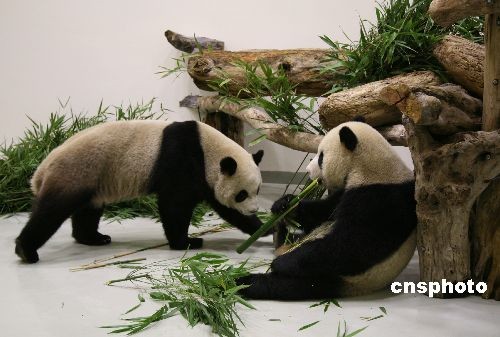 大陸贈臺一對大熊貓“團團”和“圓圓”12月23日晚間抵達臺北,住進臺北市立動物園的新光特展館!皥F團”和“圓圓”抵達新家半個小時后開始進食。這是他們在臺北新家的第一餐。 中新社發 路梅 攝