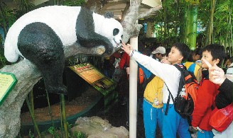 民眾抵達(dá)熊貓館后,依序由室外展示場(chǎng)進(jìn)入。動(dòng)物園表示,若天氣良好,就可在室外展示場(chǎng)的模擬棲地風(fēng)景的攀爬架、樹(shù)洞、平臺(tái)上看見(jiàn)團(tuán)團(tuán)、圓圓的身影。進(jìn)入熊貓館后,民眾先觀看各種大熊貓的保育資料,接著便進(jìn)入室內(nèi)展示區(qū),隔著4公分厚,經(jīng)防霧處理的玻璃與大熊貓對(duì)望。區(qū)內(nèi)也設(shè)有大型的樹(shù)干,供大熊貓休憩、攀爬。小朋友們參觀展示區(qū)內(nèi)的大熊貓模型,已讓參觀小朋友非常興奮,直喊“要是真的多好。”