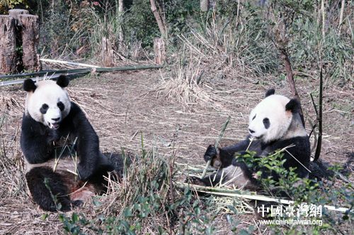 在地震中機敏逃生后的大熊貓“團團”和“圓圓”,現住在四川雅安碧峰峽大熊貓飼養基地,兩岸媒體到達時,它們正在開心進食。