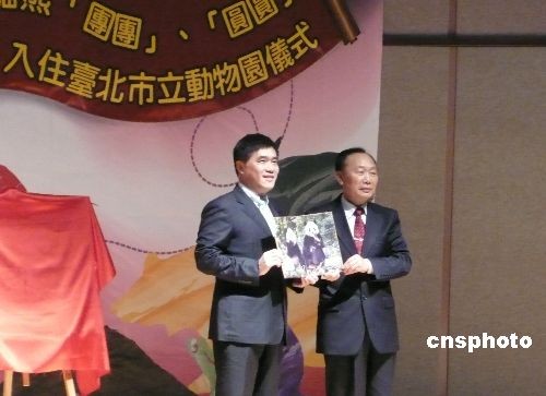 臺北市政府十二月二十四日上午舉行儀式,歡迎“團團”“圓圓”入住臺北市立動物園。圖為歡送“團團”“圓圓”赴臺代表團團長趙學敏向臺北市長郝龍斌贈送“團團”“圓圓”基因檔案,象征交接正式完成。 大陸贈臺大熊貓“團團”“圓圓”十二月二十三日晚間抵達臺北市立動物園。 中新社發 路梅 攝