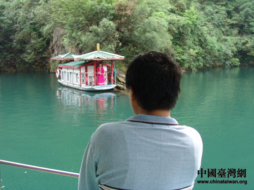 游船劃出碧波,載著臺(tái)灣客人環(huán)湖一周,領(lǐng)略“孔雀開(kāi)屏”、“金龜出水”、“仙女照鏡”等神奇自然景觀,微風(fēng)徐來(lái),心曠神怡,確似身在瑤池。