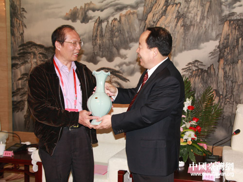 平頂山市長(zhǎng)李恩東將著名汝瓷作為禮物送給劉大釧先生(中國臺(tái)灣網(wǎng) 宿靜 攝)