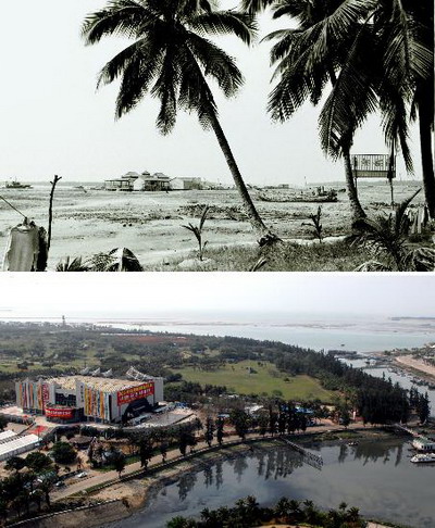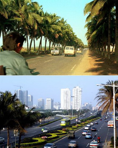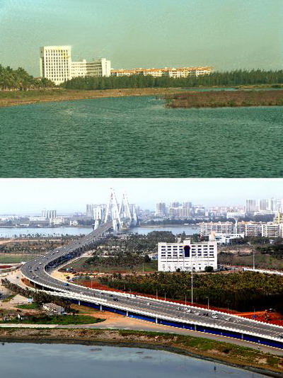 這是?谑袨I海大道今昔對照圖。上圖:1990年1月,“濱海大道”僅僅是由?诔菂^通往秀英港碼頭的一條兩車道公路。下圖:現在的濱海大道已經是縱貫?谖骱0丁㈤L達20多公里、雙向六車道的城市交通主干道(2008年3月12日攝)。