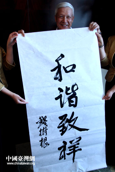 解放軍總參謀部原副總參謀長(zhǎng)錢(qián)樹(shù)根寫(xiě)下“和諧致祥”(中國(guó)臺(tái)灣網(wǎng) 李徽 攝)