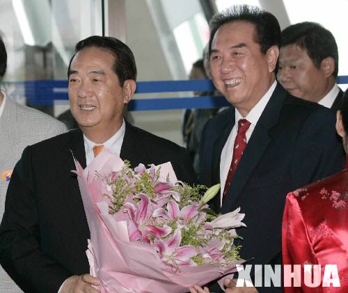 這是中共中央臺灣工作辦公室主任陳云林(前右)在浦東機場迎接宋楚瑜。 (新華社記者 張明 攝)