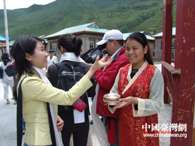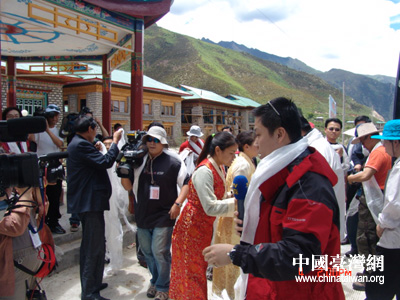 在現場,來自臺灣的東森電視臺、中天電視臺等媒體都把藏民的這種歡迎儀式拍攝下來,準備介紹給島內的民眾,讓島內民眾能更充分地了解藏族同胞的風俗民情。(謝曉萍)
