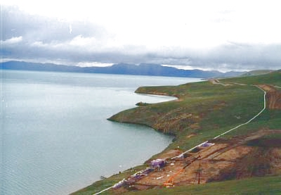 中鐵十九局青藏鐵路工程指揮部高度重視沿錯那湖鐵路建設的環境保護工作。圖為他們用裝填了沙土的白色編織袋將施工區和湖區隔開,綿沿30多公里,有效的保護了錯那湖在施工期間不受污染。 來源:《中國西藏信息中心》