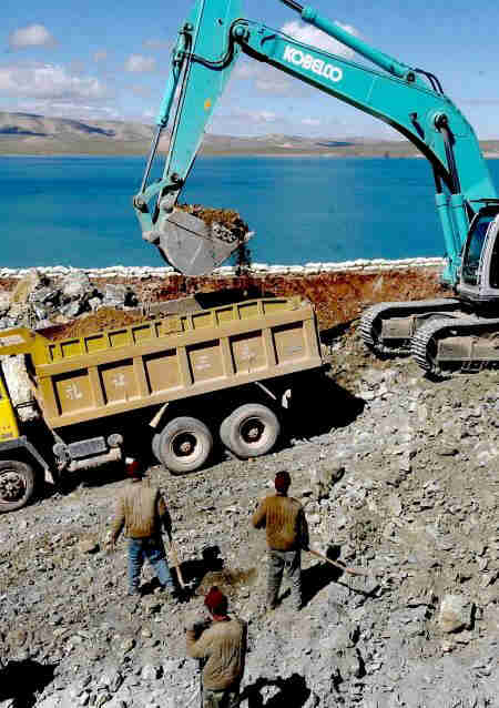 9月19日,在青藏鐵路工地上施工的中鐵十九局建設者在錯那湖邊的沙袋防護墻內工作。對沿線環保十分關注的青藏鐵路建設者通過設立沙袋防護墻、移植草皮、建立高原珍稀野生動物活動觀測站和定期對湖水進行監測等形式,妥善保護了藏北高原淡水湖--錯那湖。錯那湖位于西藏安多縣境內,面積400多平方公里,被當地藏族群眾奉為“神湖”。青藏鐵路有40余公里在湖邊經過。新華社記者格桑達瓦攝?