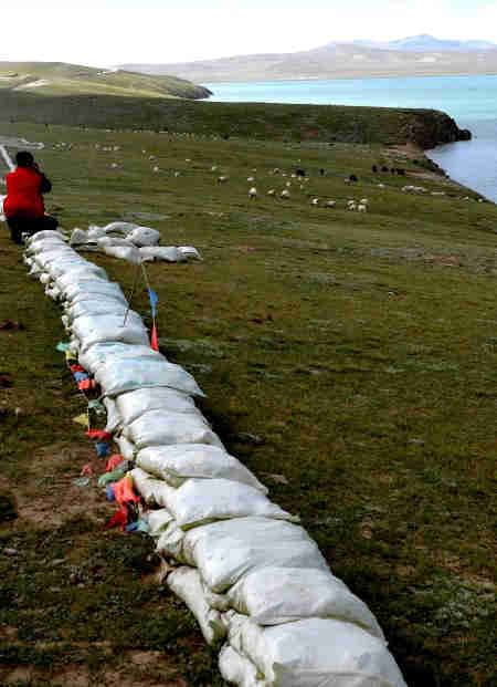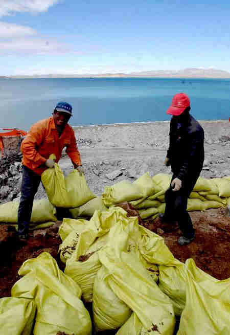 9月19日,在青藏鐵路工地上施工的兩名中鐵十九局建設者在錯那湖邊用編制沙袋堆砌防護墻,用來防止工地的污水和垃圾沖入湖中,同時控制施工作業界限。對沿線環保十分關注的青藏鐵路建設者通過設立沙袋防護墻、移植草皮、建立高原珍稀野生動物活動觀測站和定期對湖水進行監測等形式,妥善保護了藏北高原淡水湖--錯那湖。錯那湖位于西藏安多縣境內,面積400多平方公里,被當地藏族群眾奉為“神湖”。青藏鐵路有40余公里在湖邊經過。新華社記者格桑達瓦攝?
