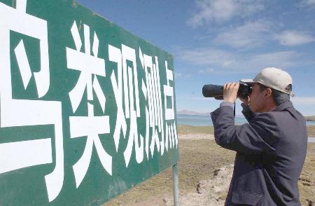 9月19日,在青藏鐵路工地上施工的中鐵十九局環保工程師王得新在錯那湖邊鳥類觀測點用望遠鏡觀察湖里各種鳥類的活動。對沿線環保十分關注的青藏鐵路建設者通過設立沙袋防護墻、移植草皮、建立高原珍稀野生動物活動觀測站和定期對湖水進行監測等形式,妥善保護了藏北高原淡水湖--錯那湖。錯那湖位于西藏安多縣境內,面積400多平方公里,被當地藏族群眾奉為“神湖”。青藏鐵路有40余公里在湖邊經過。新華社記者格桑達瓦攝?