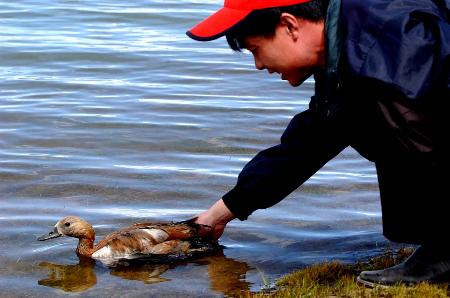 在青藏鐵路工地上施工的中鐵十九局炊事員彭顯富與錯那湖里的黃鴨成了“好朋友”,他經常給黃鴨喂食。對沿線環保十分關注的青藏鐵路建設者通過設立沙袋防護墻、移植草皮、建立高原珍稀野生動物活動觀測站和定期對湖水進行監測等形式,妥善保護了藏北高原淡水湖--錯那湖。錯那湖位于西藏安多縣境內,面積400多平方公里,被當地藏族群眾奉為“神湖”。青藏鐵路有40余公里在湖邊經過。新華社記者格桑達瓦攝?