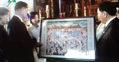 隨后,馬崎連氏宗親贈送給連戰六份禮物,分別是家鄉馬崎的米、水、農民漆畫作品《盛世祥和》、象征團結友愛的桂圓干、當地農民書法作品以及新修訂的連氏族譜。
