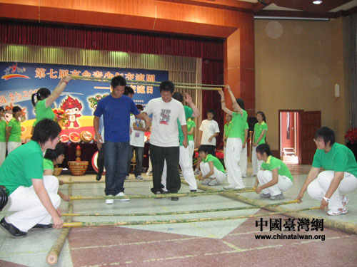 隨后豐臺二中表演了具有民族特色的跳竹竿節目,并邀請臺灣師生共同上臺表演。雖然之前沒有經過訓練,臺灣師生依然能有節奏地跟著跳動。大家手牽手,玩得不亦樂乎。